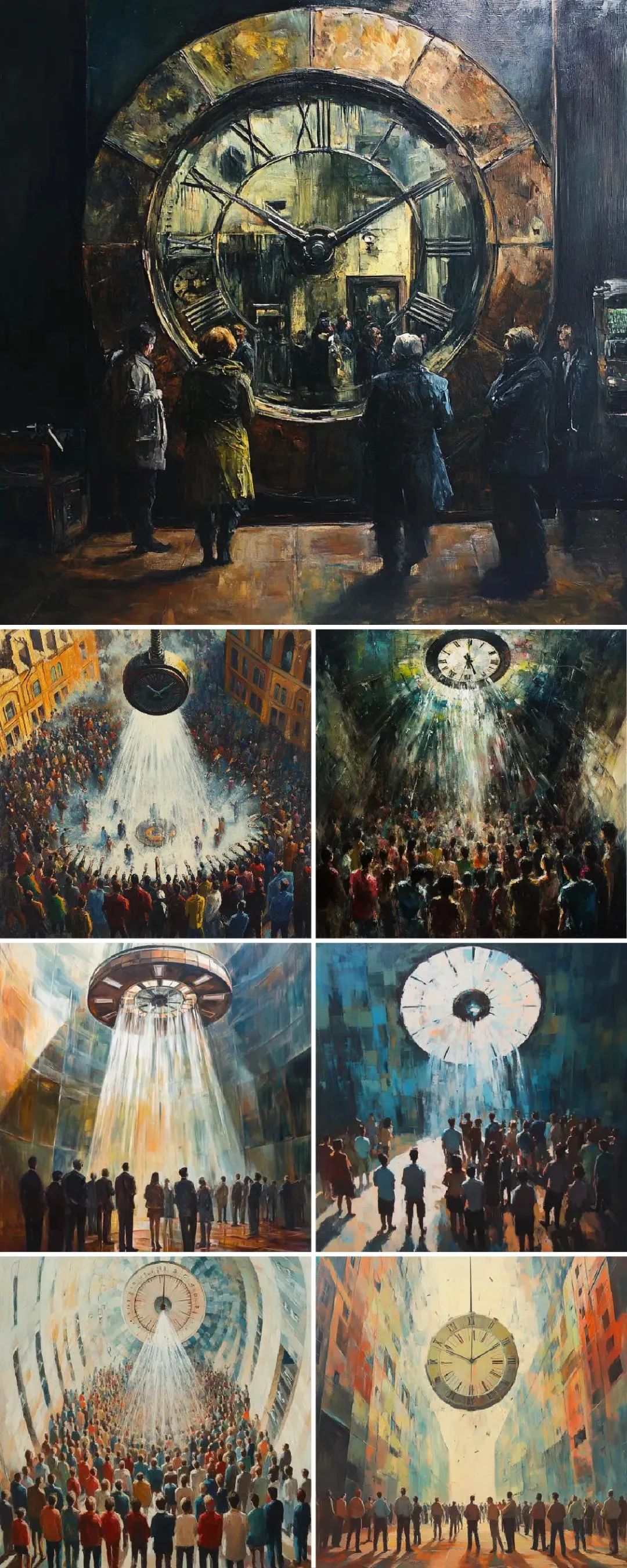 Liblib AI / #prompt:There is a huge clock whose surface is a mirror. People pass in front of this clock with their clothes on,and the corresponding person in the mirror has no clothes .,Oil painting,this work is reminiscent of the style of Gustav Ginz,industrial and atmospheric style,bright colors,strong contrast,