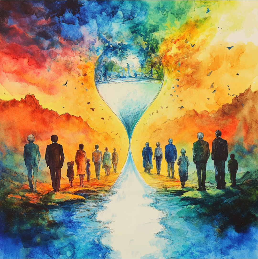 MJ / #prompt:Surreal depiction of time‘s psychological perception, showing how emotions warp the flow of time. Time stretches and compresses around distorted figures and landscapes. Show scenes with vibrant colors for happy moments and darker tones for painful or anxious moments, symbolizing how time is perceived differently based on emotional states. Use dreamlike, flowing elements to create a sense of time bending and shifting.In the style of light watercolor. With a human standing in it.