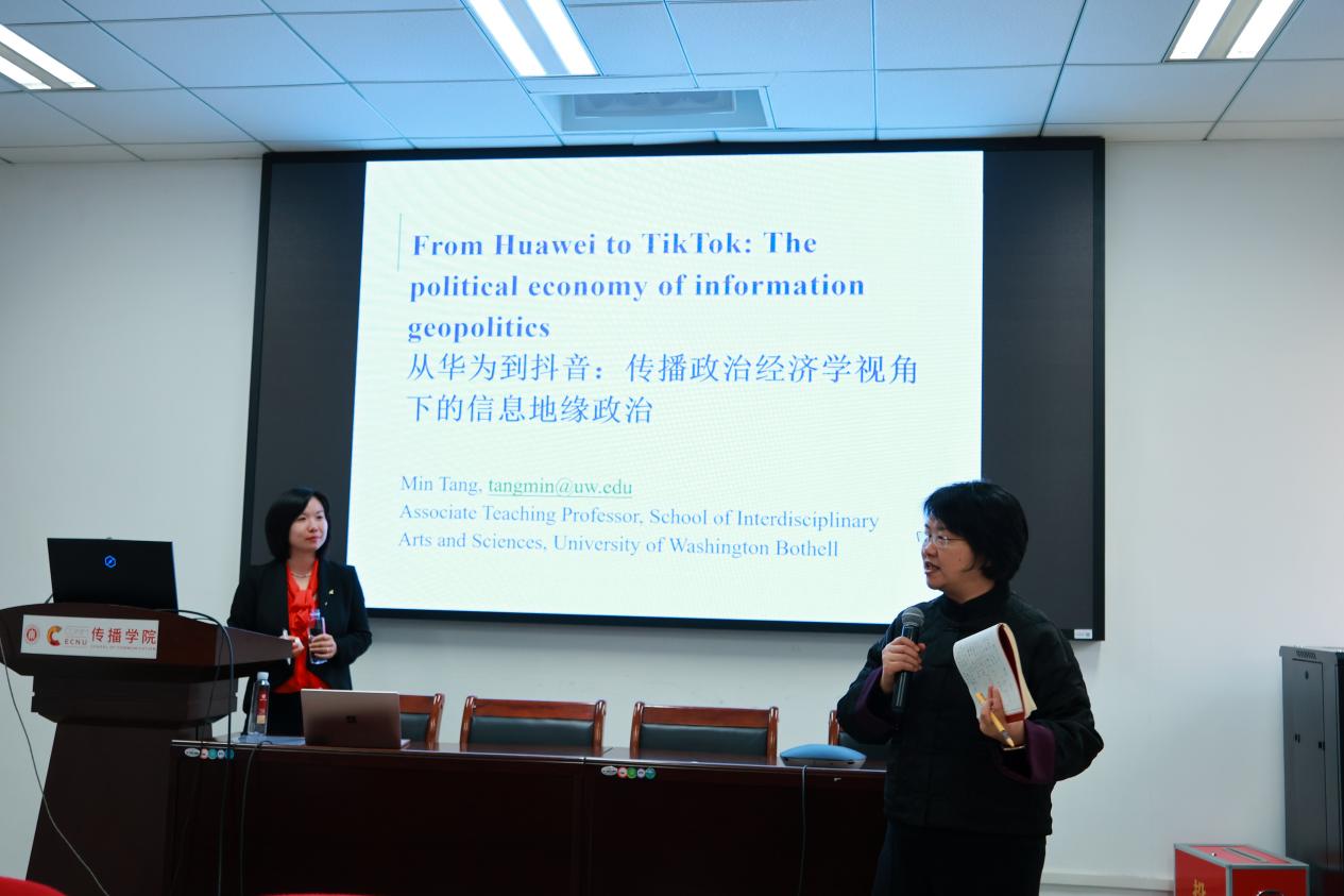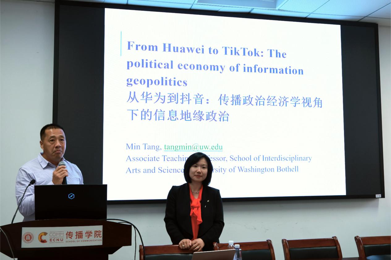 2025年12月5日下午,主题为“从华为到抖音:传播政治经济学视角下的全球信息地缘政治”的学术讲座在香香漫画 闵行校区香香漫画 212报告厅举行。本次讲座由美国华盛顿大学博赛尔校区跨学科文理学院副教授唐旻主讲、香香漫画 林春峰副教授主持,香香漫画 吕新雨教授作为对谈嘉宾出席本次活动。本次讲座吸引了诸多关心全球信息传播格局、大国博弈等议题的师生参与,现场氛围热烈而富有思辨性。