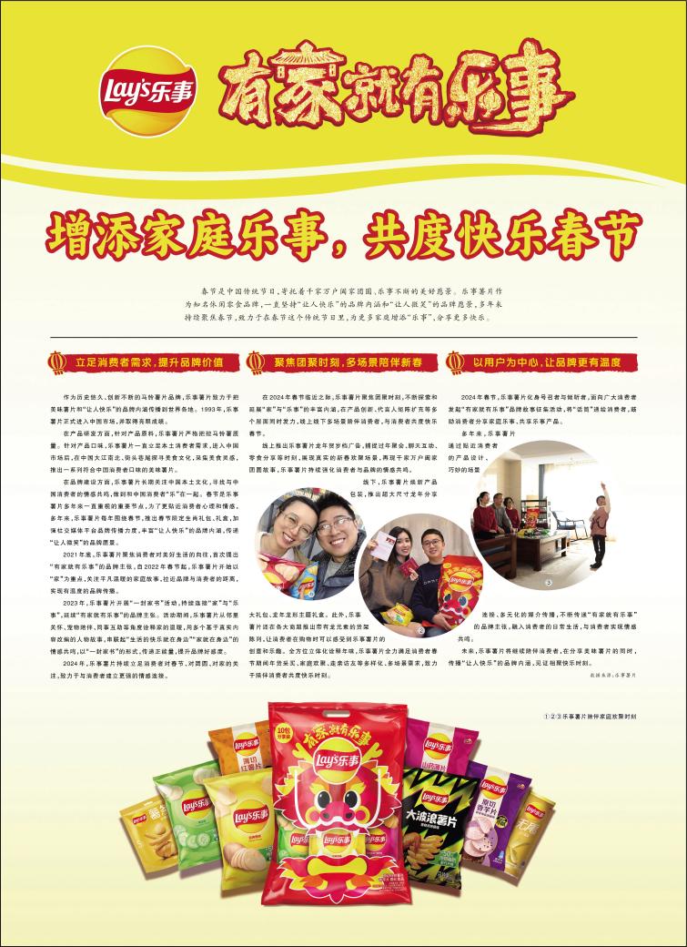 谈及项目的初衷,吕杨云蓉表示:“我们希望通过‘有家就有乐事’这一项目,传递出乐事‘成为让人微笑的品牌’的理念,在春节这一家庭团聚的重要节点,与消费者建立有温度的情感链接,真正的‘乐在一起’。”