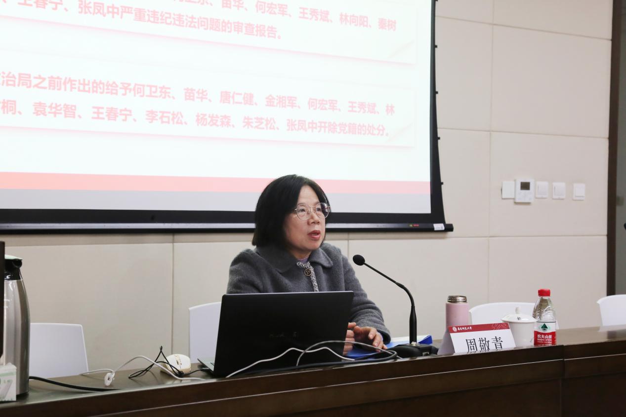 周敬青教授以历史为坐标,指出了二十届四中全会的重要意义,她系统梳理了“十四五”时期我国在各领域取得的历史性成就,深刻阐释了新时代发展的实践根基与底气所在。在此基础上,周敬青教授系统介绍了国民经济和社会发展第十五个五年规划的制定背景、核心目标与重点任务,重点阐述了高校各院系如何深入全面学思践悟二十届四中全会精神。周敬青教授指出,各级党组织应学深悟透全会精神,细化任务清单,破解实践难题,在学习会议精神过程中凝聚工作合力。