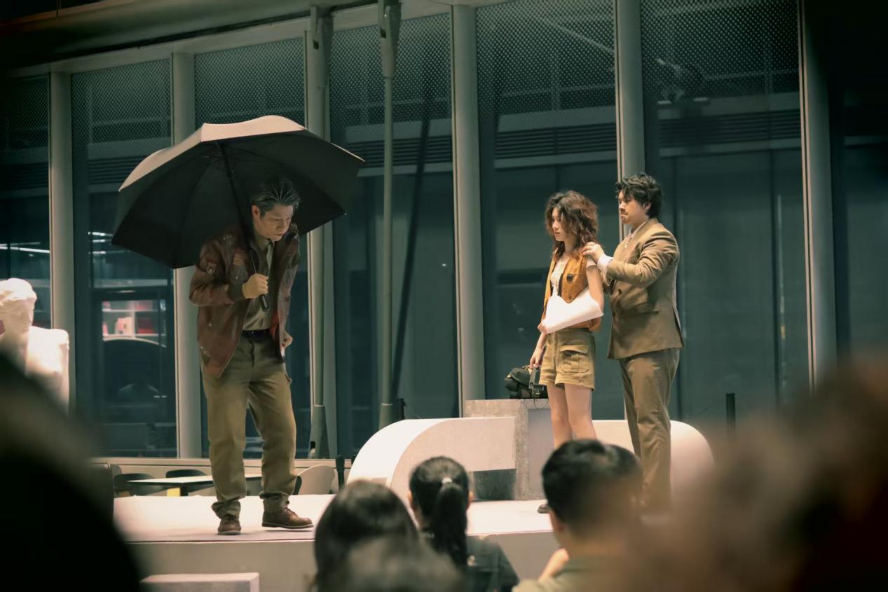 在这里,观众们可以完全沉浸在表演之中。比如在一进场,演员们就穿梭在观众之中,给他们送上了玫瑰花;在表演过程中,观众可以近距离看到演员的每一个动作,每一个微表情。窗外是真实流转的城市夜景,窗内是戏剧里的悲欢离合,现实与戏剧的界限在灯火中消融。这种沉浸感,是传统剧场难以复制的城市馈赠。包括我们,在完成基本的拍摄之后,也完全沉浸到了戏剧之中。在两个小时内,我们真切体验到了剧中角色的喜怒哀乐、取舍选择;明白了这栋“摩天大楼”对于他们的特殊意义。