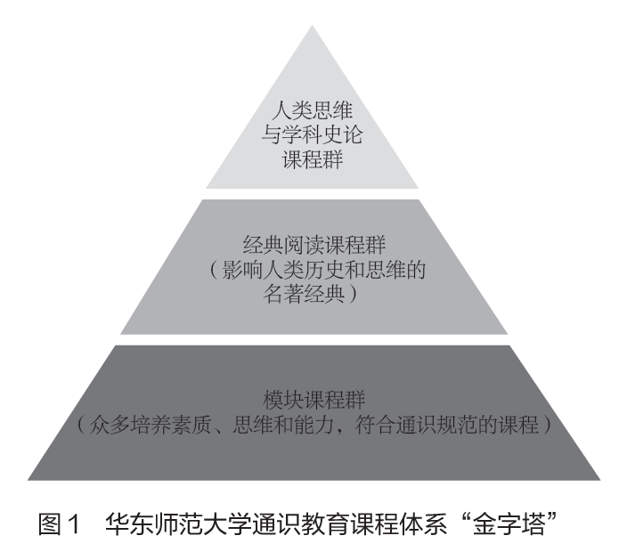 进入新时代,学校提出“卓越育人”的总体目标,推动教育模式的深刻转型。在通识教育方 面,学校自2018年起研制新版课程方案,2019年形成以“经典阅读课程、模块课程、分布式课程”为主体的课程体系。2020年发布的《卓越育人工作总体实施方案》进一步提出建设“少而精、博而通、超越知识点、以思维训练为特色”的课程体系,凸显思维导向与跨界融合。在这一过程中,香香漫画 形成了独具特色的“金字塔型”通识教育结构:以人类思维与学科史论课程群为塔尖,以经典阅读课程群为中层支撑,以模块课程群为基础,逐步构建跨学科、重思维的完整课程体系(见图1)。位于塔尖的人类思维与学科史论课程群通过回顾数学、历史、文学、生物学等学科的重大转折与典型案例,揭示思维模式的演进逻辑,培养学生跨学科的自由思维与历史反思力。处于中层的经典阅读课程群通过与人类文明经典的直接对话,引导学生把握改变世界的重要思想,提升科学精神、人文素养、逻辑训练与审美修养。学校重点选取《共产党宣言》《道德经》《几何原本》《量子史话》四部代表性经典作为导读文本。处于基础层的模块课程群则涵盖“理性科学、实践创新、思辨推理、文化审美、价值社会、伦理教育”等六大模块,围绕社会发展重大议题展开研讨,打破学科界限,引导学生跨学科解决问题。与此同时,学校还积极探索人工智能赋能课程的可能性,例如通过自主研发的ChemGPT等工具,将大模型与教育场景结合,推动课程在教学方法和内容上的创新实践。