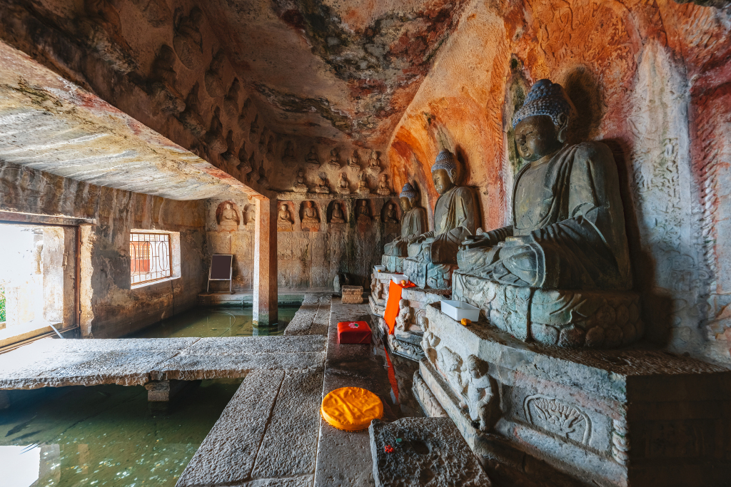 第五窟水陆殿是金灯寺的核心。窟内有一上升泉,长年涌水不息,“水常与户阙平”。池中架起一桥,两侧形成天然的放生池,池内有金鱼数尾,钱币鳞鳞。