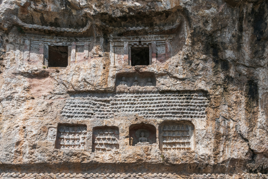 寺内古塔与古碑林立,石窟和山体相连,历代工匠在岩壁上用高浮雕和浅浮雕的技法雕刻出木构建筑的普拍枋、斗拱、门窗、瓦当、门当,连碑碣的碑额、碑座都用高浮雕的形式完美地呈现出来,栩栩如生,云雾缭绕中,更显幽深。