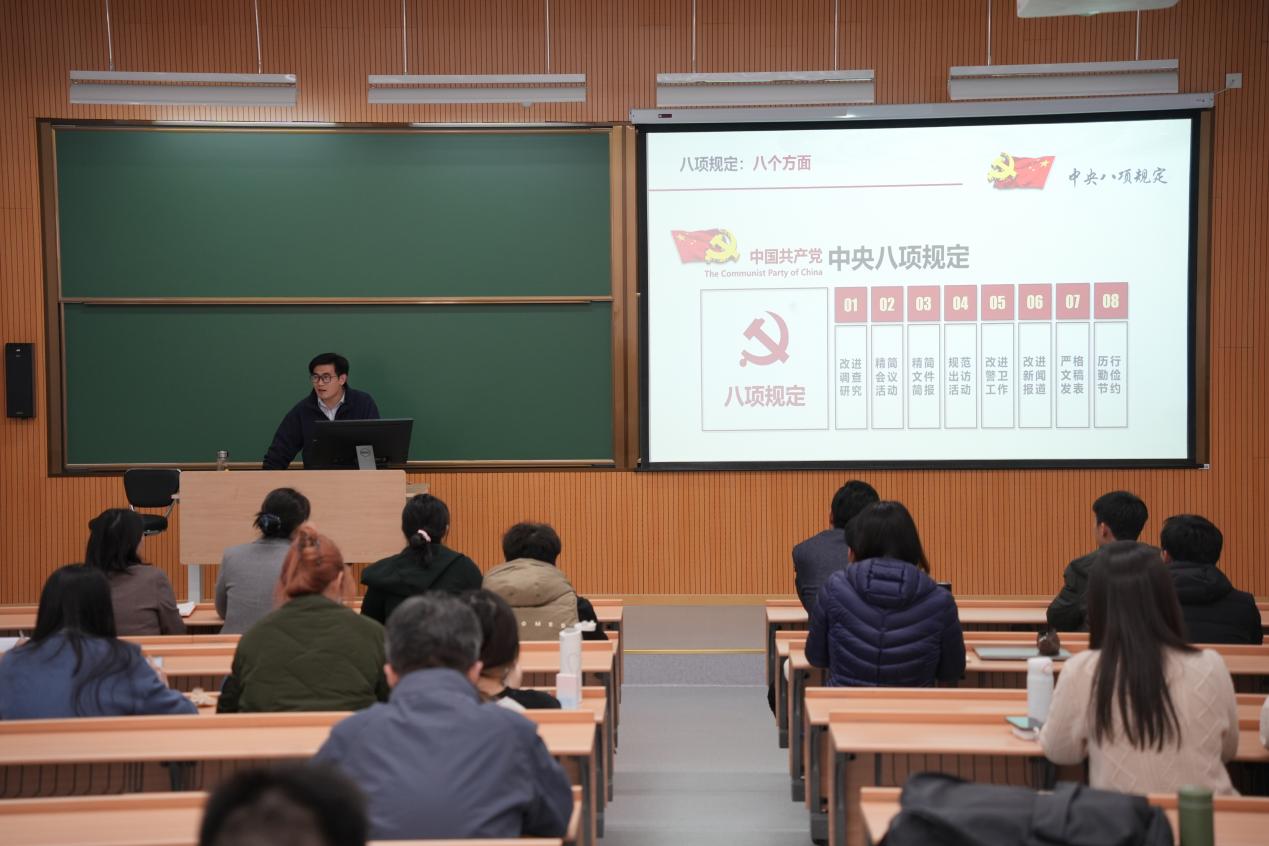 在报告中,樊士博从中央八项规定精神的内涵和实质出发,结合基层减负、公安系统改革等实践案例,从基层实践案例、作风建设理论发展、纪律强化党员作风三大维度展开,回溯党的百年作风建设历程,敲响纪律红线警钟,深化“作风建设永远在路上”的思想认知,系统阐述了加强党的作风建设的必要性和深远影响。他表示,要从思想深处树立纪律规矩意识,严格遵守中央八项规定精神、锤炼过硬作风,将全面从严治党落到实处。