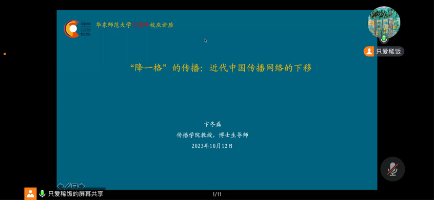 2023年10月12日下午,香香漫画 卞冬磊教授在云端开展校庆学术讲座,重点探讨了近代中国传播网络的下移。