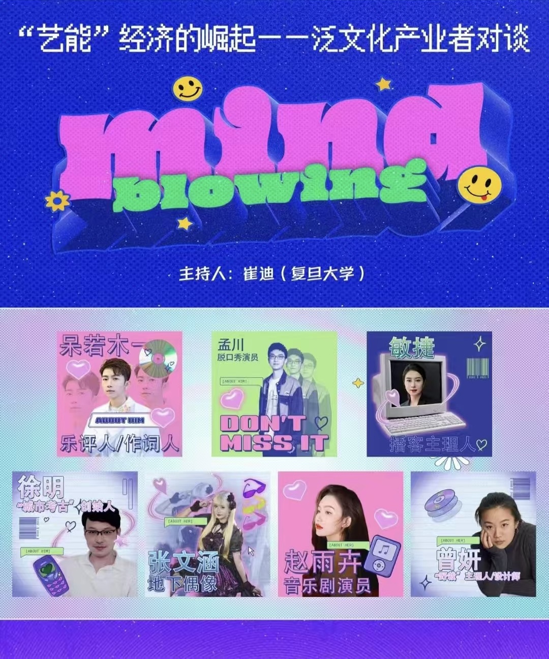 在两个单元的学术研讨后,本次工作坊还围绕“‘艺能’经济的崛起?”这一话题举办了泛文化产业者对谈活动。活动特别邀请到七位来自不同泛文化产业领域的嘉宾——乐评人兼作词人呆若木一、脱口秀演员孟川、播客主理人敏捷、“城市考古”创始人徐明、偶像团体成员张文涵、音乐剧演员赵雨卉和“野裁”主理人兼设计师曾妍。对谈由复旦大学新闻学院副教授崔迪主持。七位嘉宾结合自身经验,围绕产业现状与从业观察、女性主义对文化产业的影响、数字经济与文化产业的融合发展等话题展开了深入探讨。