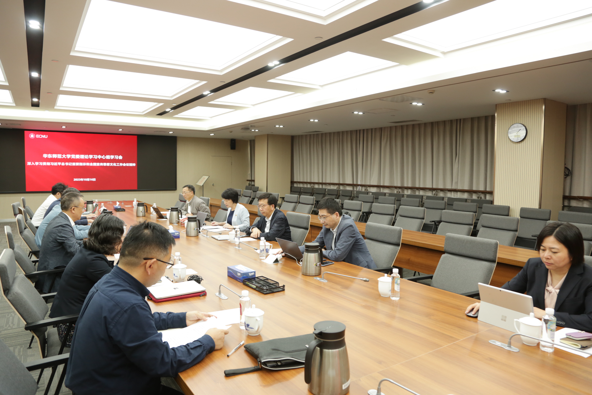 10月16日下午,华东师大举行党委理论学习中心组会议,专题学习习近平总书记重要指示和全国宣传思想文化工作会议精神。全体校领导、校党委理论学习中心组成员参加学习,学习会由校党委书记梅兵主持。