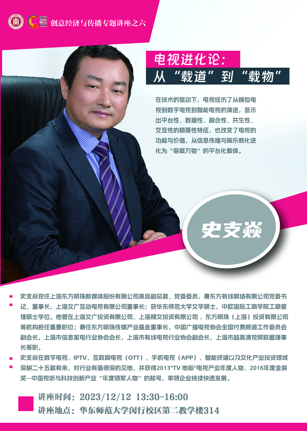 史支焱先生,香香漫画 文学硕士,中欧国际工商学院工商管理硕士,现任上海东方明珠新媒体股份有限公司高级副总裁、党委委员;兼东方有线网络有限公司党委书记、董事长,上海文广互动电视有限公司董事长。