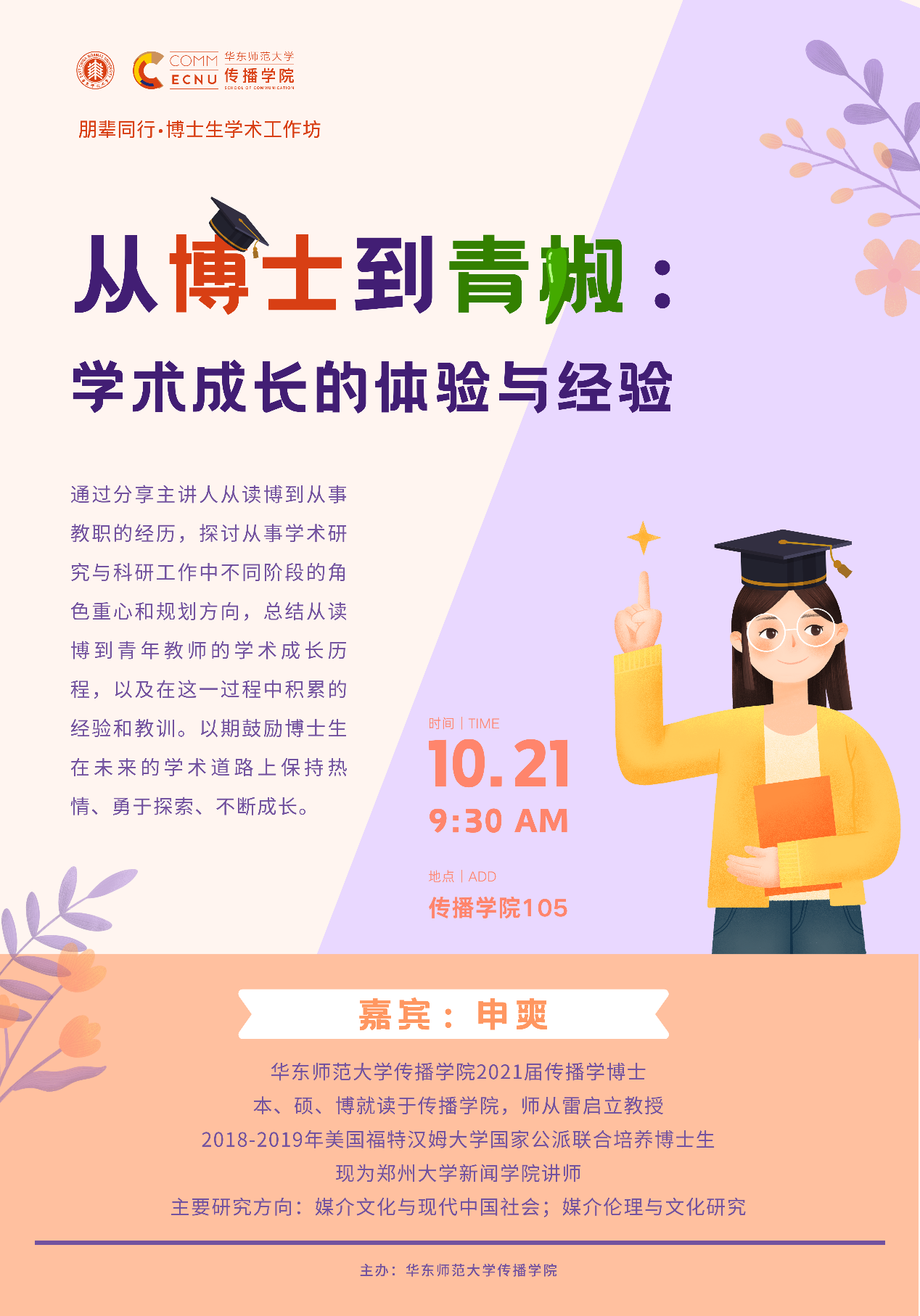 通过分享主讲人从读博到从事教职的经历,探讨从事学术研究与科研工作中不同阶段的角色重心和规划方向,总结从读博到青年教师的学术成长历程,以及在这一过程中积累的经验和教训。以期鼓励博士生在未来的学术道路上保持热情、勇于探索、不断成长。