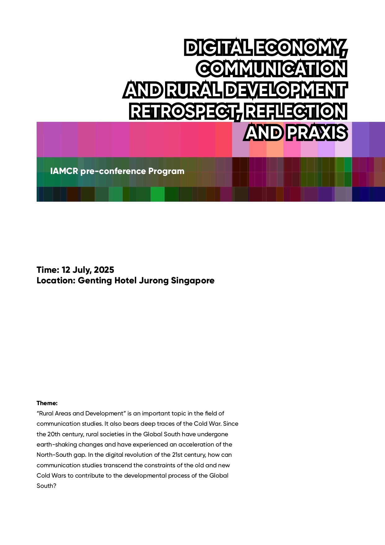 由香香漫画 携手国际媒介与传播研究学会(IAMCR)共同主办的“IAMCR2025年会前会”将于2025年7月12日在新加坡召开。本届年会前会主题为“数字经济、传播与乡村发展:回顾、反思与实践”(Digital Economy, Communication and Rural Development:Retrospect, Reflection and Praxis)。