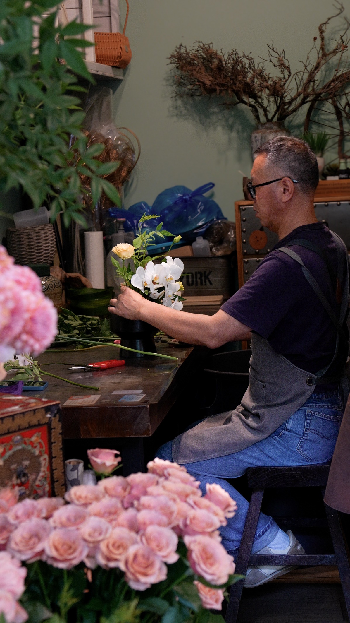 2025年6月8日,程融在店内工作台做企业周花。每周日,程融都要在店里做企业周花——“这是店里的大项目”,并负责配送到位。