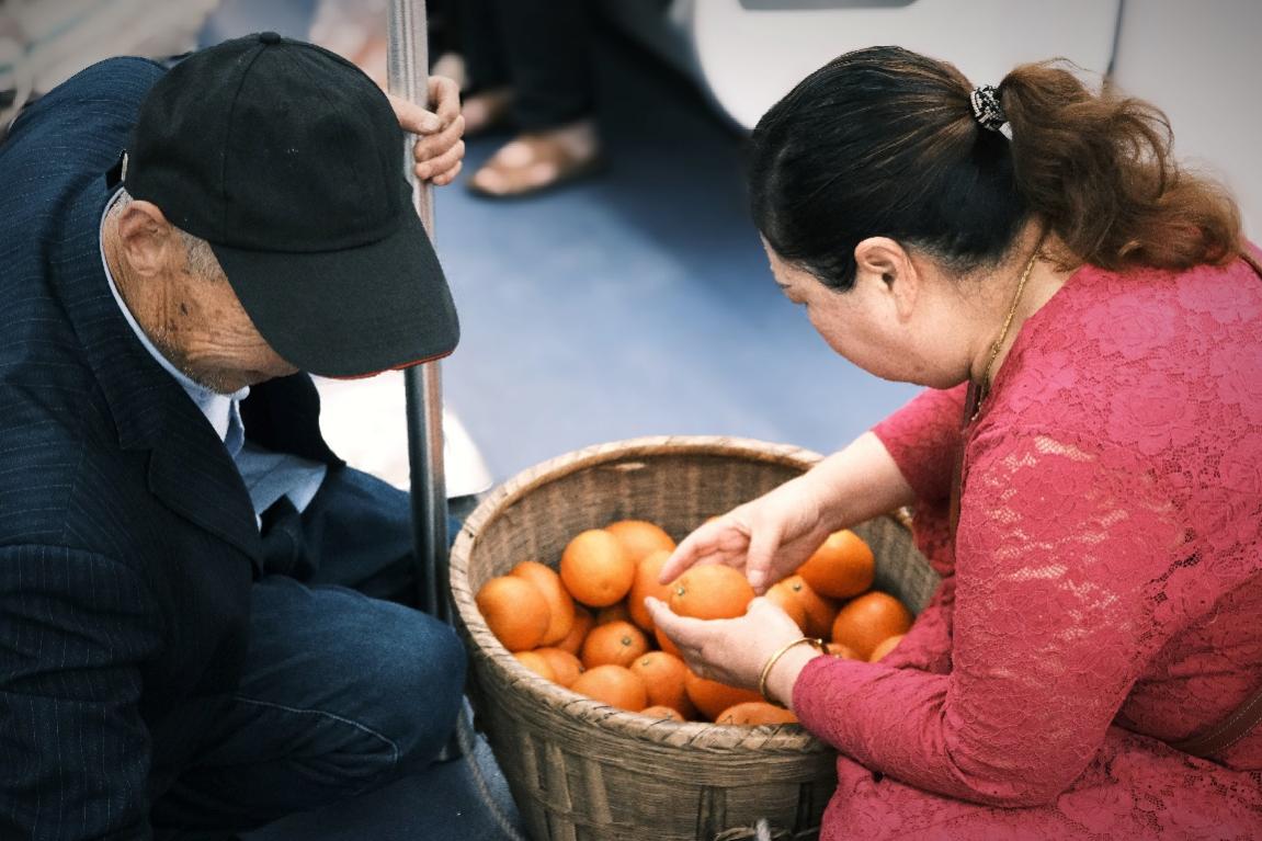 王女士正在地铁车厢内挑选菜农背篓里的橘子