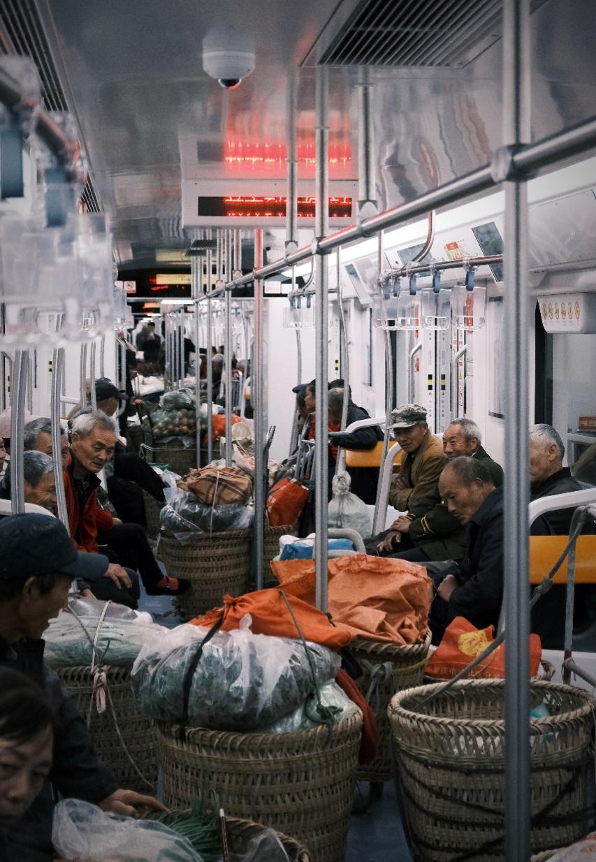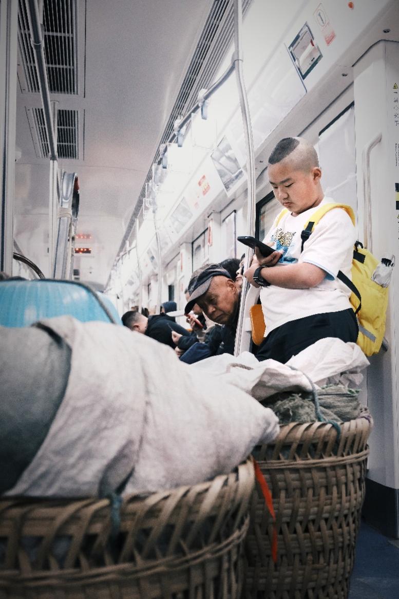 经历一系列换乘的小插曲,菜农们终于搭上了十号线。与四号线不同的是,十号线车厢不再是这群“背篓客”的天地,菜农们背着竹编背篓,穿着沾着泥点的衣裤,和背双肩包、拉行李箱的乘客比肩而立。背篓里的青菜、橘子、桂花随着列车晃动轻颤,与车厢里的短视频声、书包拉链声混在一起,倒也不显违和。