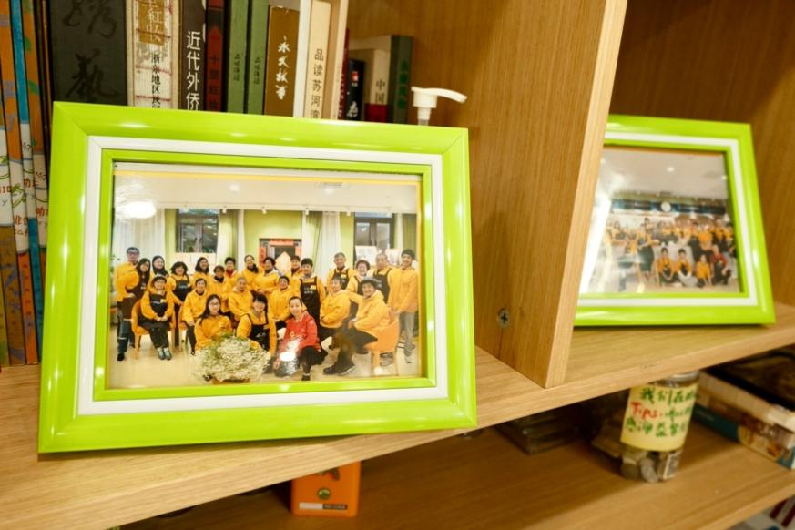 基本交流结束我们也不便打扰咖啡馆内的活动,正准备离开时,一位“老宝贝”拉住了我,兴致勃勃地邀请我欣赏咖啡馆志愿者们的大合照。她告诉我咖啡馆每年都会拍一次大合照,嵌入相框摆在展台上。“你看,这个是我”,这位“老宝贝”欣喜地指给我看,“每一年的合照都有我,刚开业我就来了,我也想发挥自己的价值,为社会做点贡献”。想必,这也是每一位记忆咖啡馆“老宝贝”的心声吧——重拾自我价值。