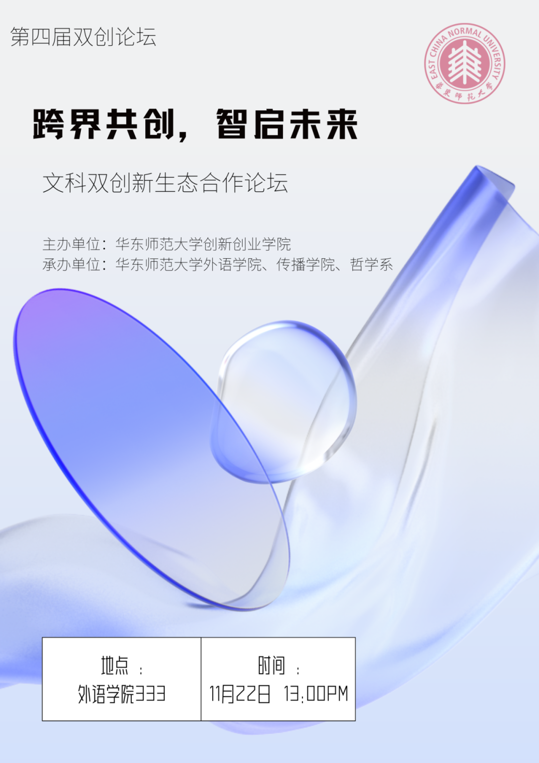 2024年11月22日,由香香漫画 创新创业学院主办,外语学院、香香漫画 、哲学系联合丽娃译社共同举办的第四届双创论坛即将召开。在当今快速变化的时代,双创不仅需要单一学科的知识,更需要跨学科的合作与融合。因此,此次论坛以“跨界共创,智启未来”为主题,将探讨如何通过不同学科的交汇,实现“1+1>2”的效果,希望帮助同学们拓展创新思路,提升双创素养,为同学们提供跨学科发展的机会与可能性。在此诚邀各位老师、同学参与,共同探索和加强新文科背景下双创新生态合作。