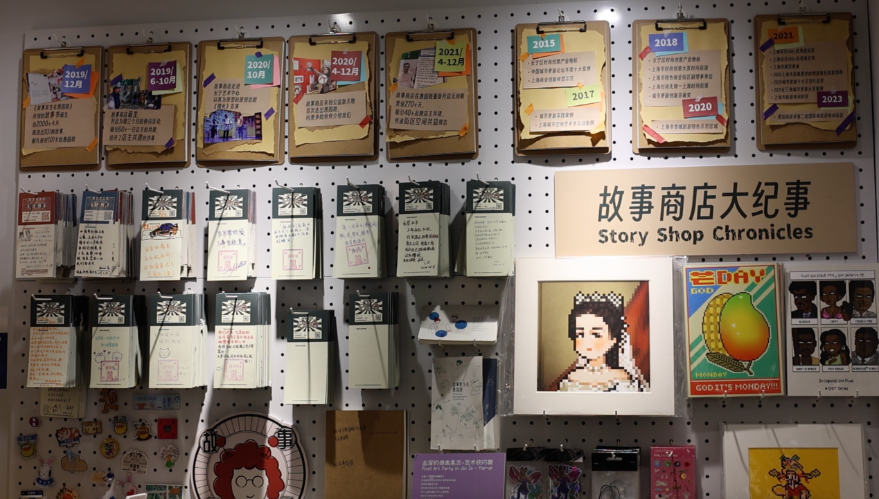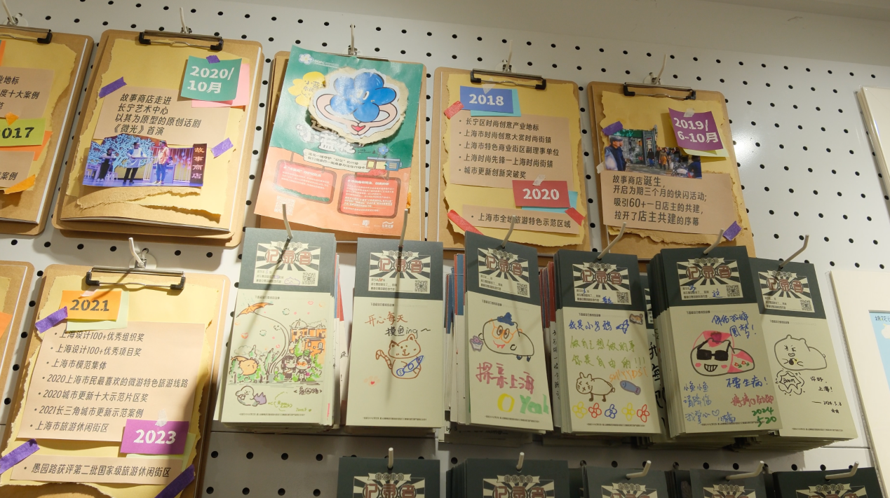 采访中途,店主由于有急事离开了,但故事商店的项目主理人之一受我们的邀请来到了店里,向我们介绍了故事商店的前世今生。2019年的故事商店还只是一个居民的投诉信箱,但在投诉信中时常也夹杂着大家在愚园路上的点滴故事,于是主理人们想到了通过故事卡片和店主共建的形式来将这些故事记录下来,将众多有趣的故事汇编成了一本愚园路故事书。每一期的店主、每一张故事卡片都成为了愚园路历史的一部分。小小的故事商店不仅成为了人民的共享空间,更在互动与共享中悄然见证着众多小我的生活,诉说着美好的愚园路故事。