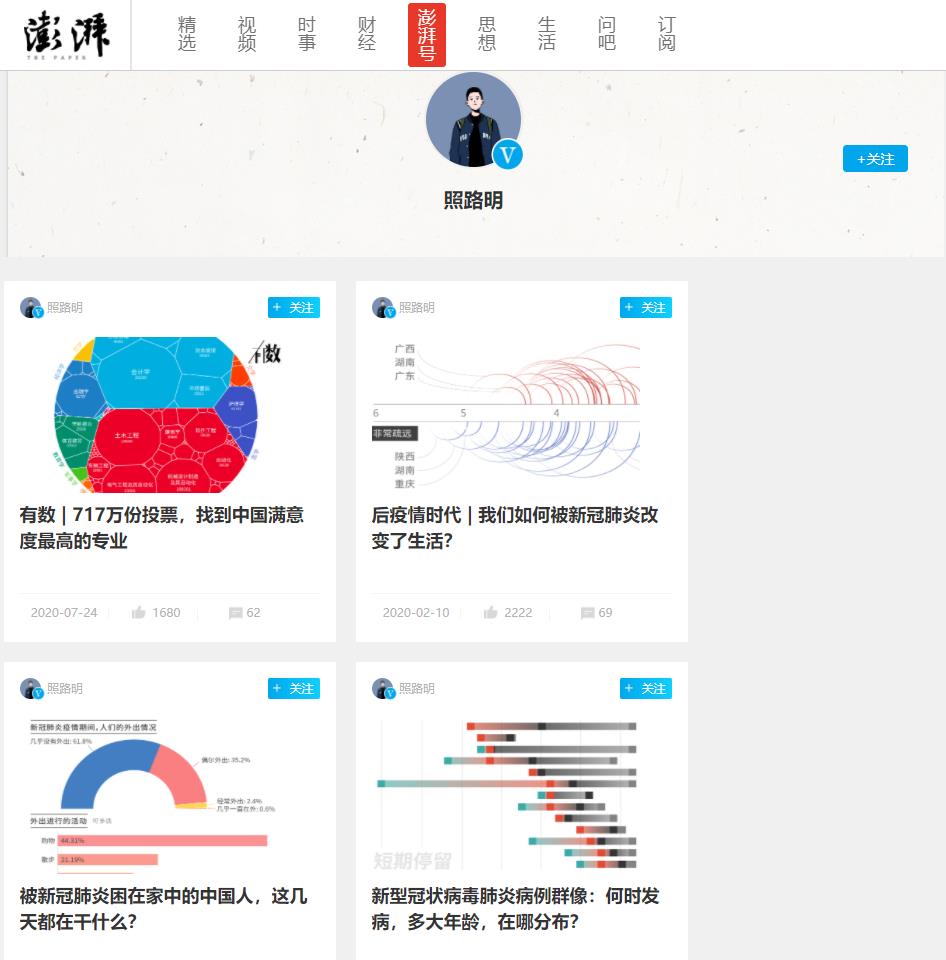 在获得“2020最澎湃创作者奖”后,赵鹿鸣在朋友圈中写下了这样一段文字,“无论是发掘新知,还是展开社会动员,数据叙事都有广袤的想象力。希望我以后能沉下心来,生产出更好的、更具公共价值的作品。”目前,赵鹿鸣正在与几个朋友进行有关“癌症村”的数据新闻项目。或许,对于他来说,关注社会议题和讲述时代故事是动力,更是使命。正像他的澎湃号入驻名“照路明”一样,他在用自己的数字和文字表达,亮起一盏又一盏明灯,照亮着前行的道路。