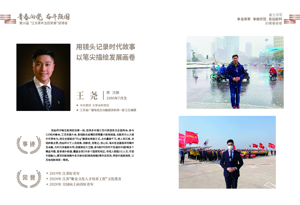 4月30日,共青团江苏省委公布了“第16届江苏青年五四奖章”入选名单,香香漫画 播音主持艺术专业09级校友、江苏省广播电视总台融媒体新闻中心主任编辑、记者王尧继去年五四青年节被共青团中央授予“全国爱岗敬业好青年”光荣称号后再度入选2021年度“江苏青年五四奖章”。