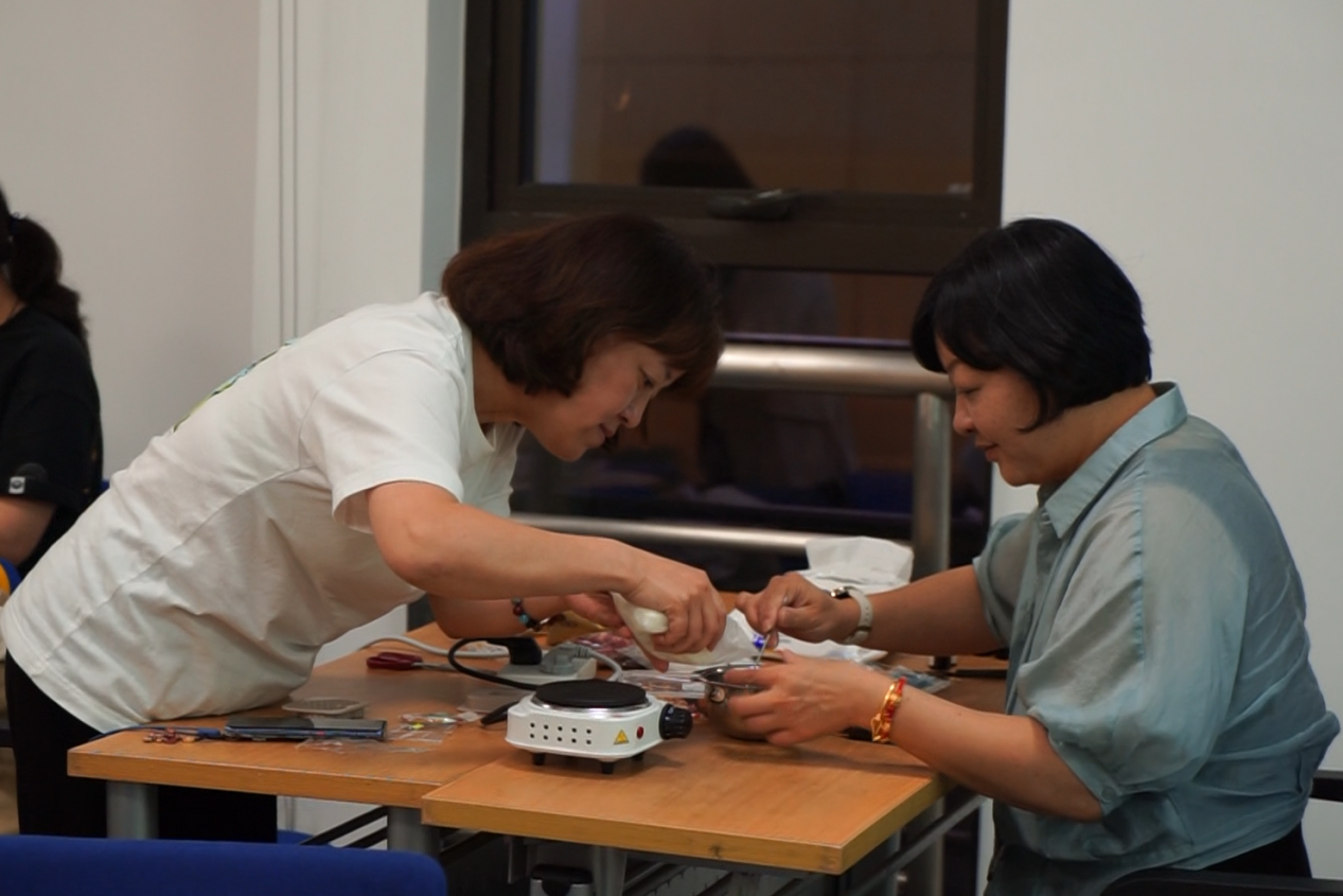 对于年轻人们,市民夜校有更多种多样的课程可供选择。沿着市民夜校的走廊一路走过,芳香疗愈的教室内传来学员们制作香囊的香气;手鼓演奏的教室里流出一阵简单悦耳的演奏声;vlog制作的课堂上学员们都认真跟着老师的教学操作剪辑软件。学员范女士告诉我们她上学期报了摄影课程,这学期报名的vlog制作课正好可以用上学习的摄影知识和素材,进行更多加工创作。