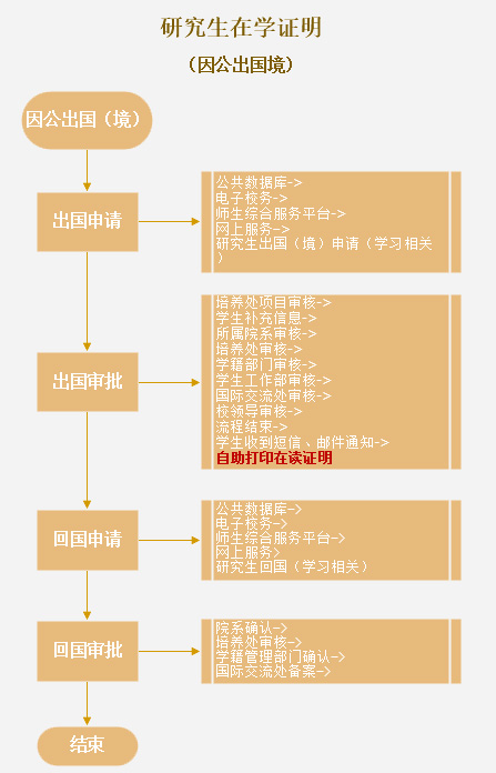 5.出国(境)事务:先到网上申请,审批通过后,到自助打印机上打印。内容为中英文版,已加盖研究生院学籍证明专用章。